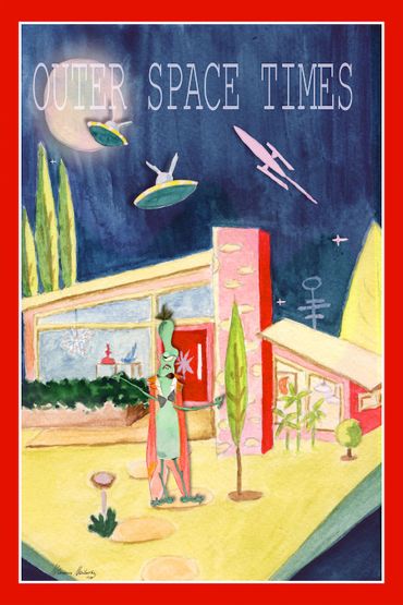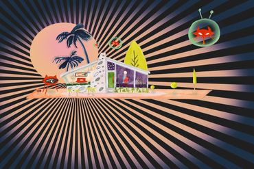 Her main themes are; Retro Cartoon Style, Atomic Age, Retro Futurism, Pin Up,